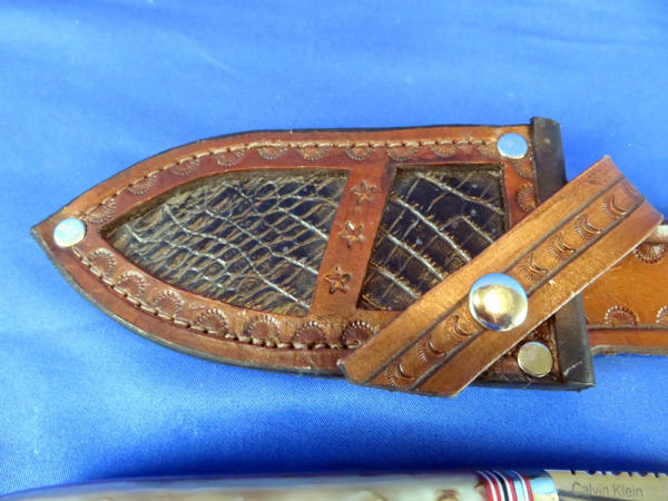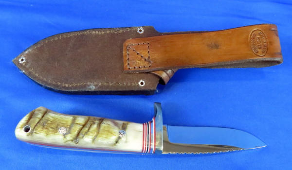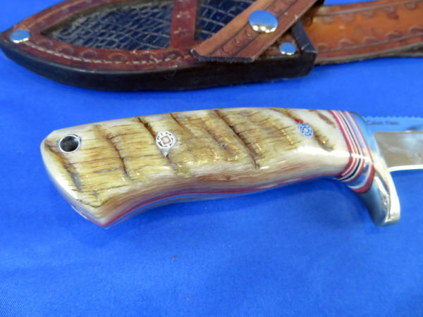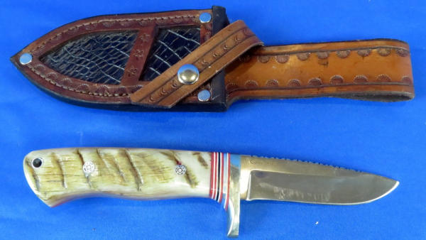 handle made of Merino Ram Horn; Blade is stainless steel 154CM Rc.60 & 3.75" long; leather sheath has alligator skin inlay; file work on top of blade; very nice
