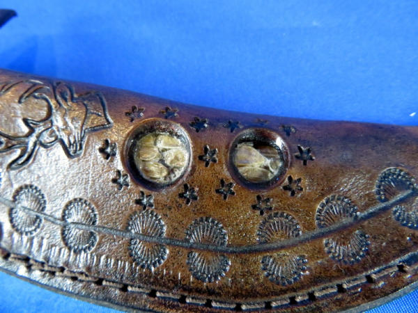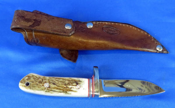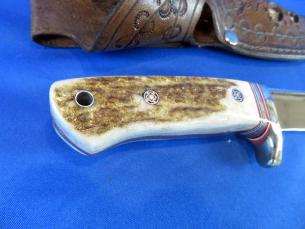 handle made of Elk Horn; Stainless Steel 154CM Rc.60 3.5" blade; leather sheath w/snake skin inlay; file work on top of blade!