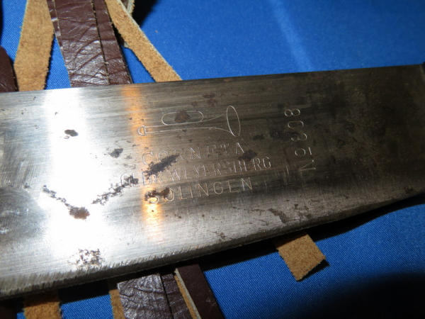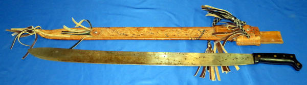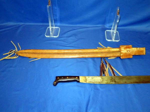 has quite a bit of wear; still has sticker label; blade is 27" long; sheath fits tight