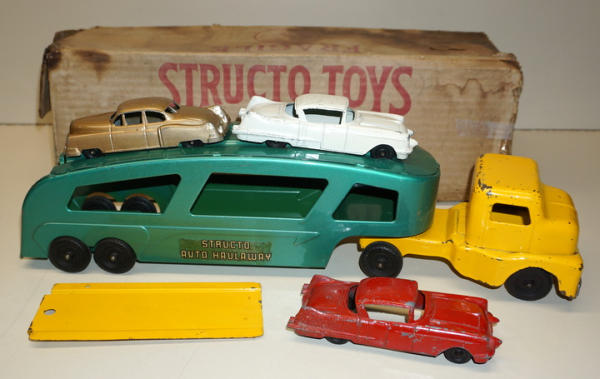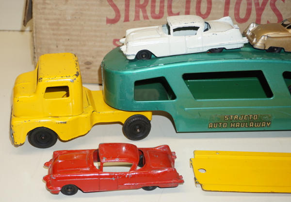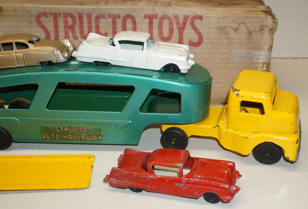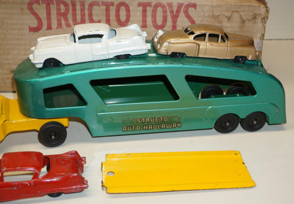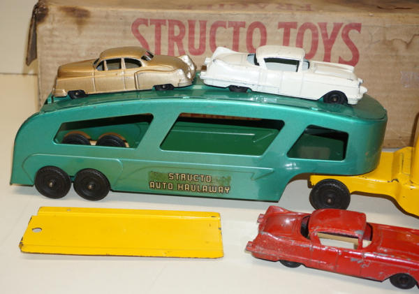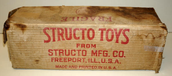 Toy is nice, 90% condition overall with 3 original cars; Box is older than this toy, I'd say a 1930's Structo Box, but was found with it, so I'm leaving it, box is fairly rough, but complete