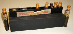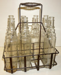 no spouts for the bottles, bottles are all nice and clean, carrier is old original with heavy patina, sells as a set for one money