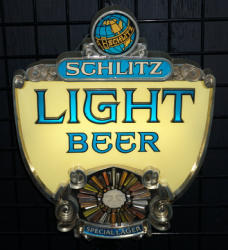 light plastic base has chips/cracks which is common for this sign, one tree is broken off; bear is very good shape, original 6-pack is pretty good, but a little faded, works; no shipping, too fragile; not the best condition, but one that doesn't come up for sale very often
