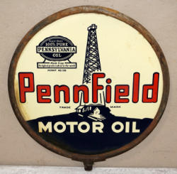 26" round sign, one side has some discoloration that might clean up, reverse side has a small chip at the base of the oil derrick, overall is a strong 8.5 condition sign that is fresh out of a barn, we just wiped it down, original steel frame, no base or pole, super piece!
