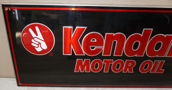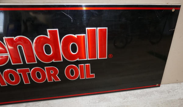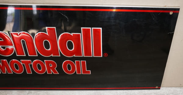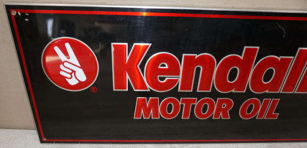 Modern made, wood back, looks like it's maybe part of a larger sign, has a couple of deep scratches, but still good color and shine, 23"x59"