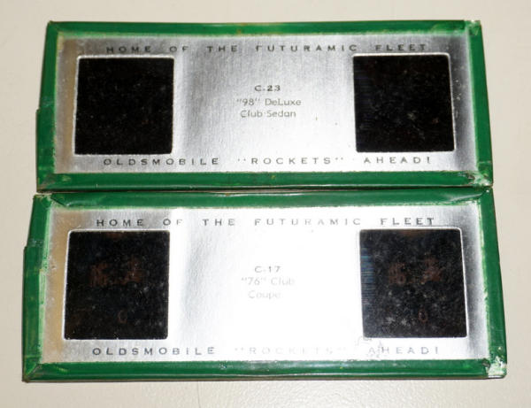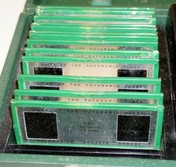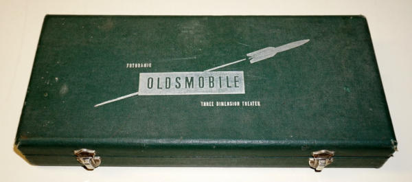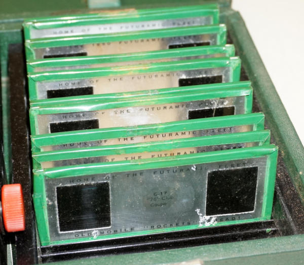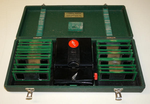 Includes the viewer and several slides, missing a few slides, cars look to be early 1950's era, hard case is about 15" long, some general wear, but a neat piece