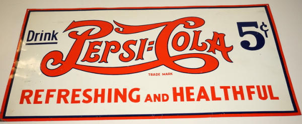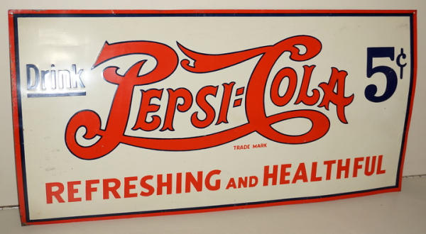 11"x23", very light tin, lightly embossed, some light edge wear and wrinkles, but overall clean and nice, 8.5 condition; very early Pepsi sign!