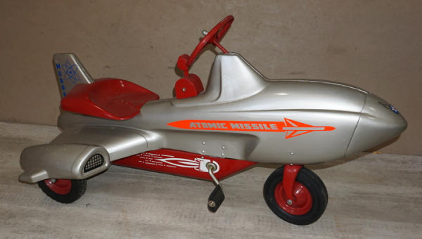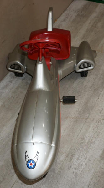 older restoration, but looks pretty good, metal is straight, throttle handles are homemade, hard to find 1950's pedal car!