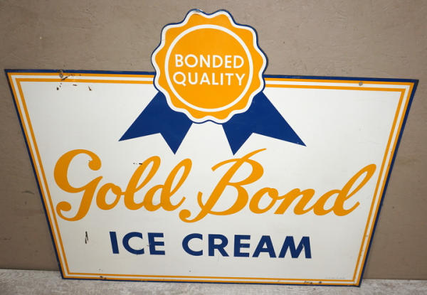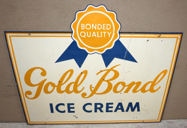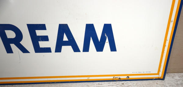36"x30", heavy steel, one side is about 8.25 condition, reverse side is 7.5 with some discoloration and a few chips, overall a very nice looking Ice Cream Sign