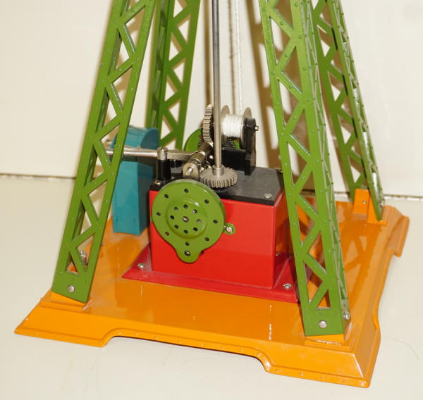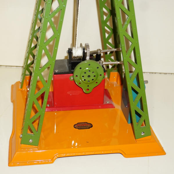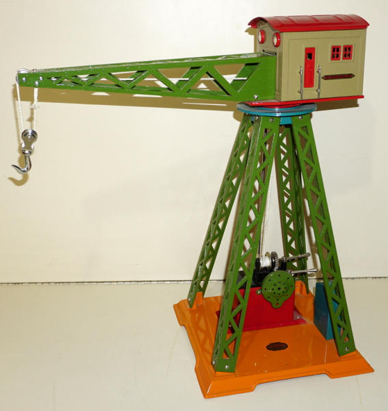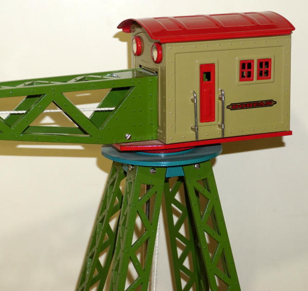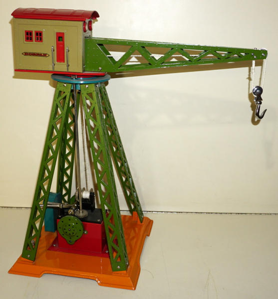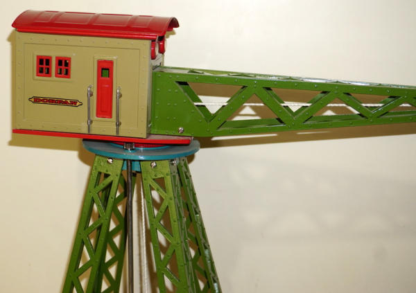 20" tall, 19" long arm, cast iron base, cast iron trellis legs, pressed steel cabin, high-quality, modern made toy; looks like it was built for Standard-size train layouts