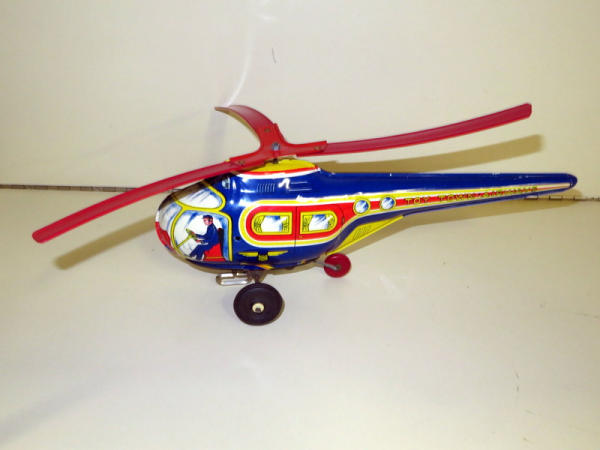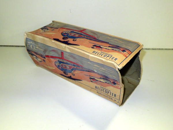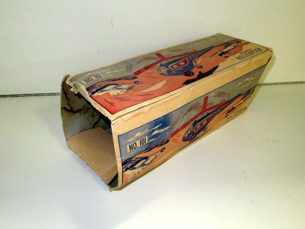 wind-up is loose but can't get it too work properly; toy has minor play wear but overall bright colors and great graphics; box has one flap in tact and another one loose, otherwise missing the rest; damage and water damage to box but still nice graphics and would still display; toy is 13" long
