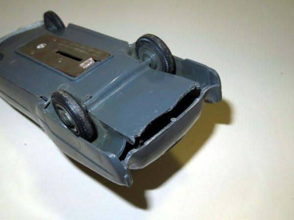 missing rear bumper and has damage on rear end; crack behind front bumper; no warping