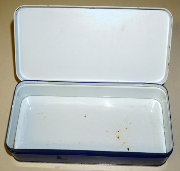 8"x4" tin box with paper label, no contents, label has some wear, never seen this piece