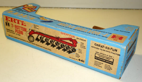 near mint toy, some light surface rust spots on the plow bottoms; box is discolored, box rates 7.5 condition