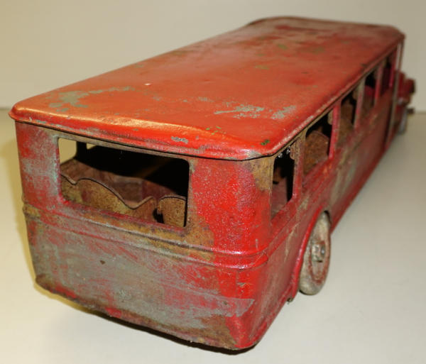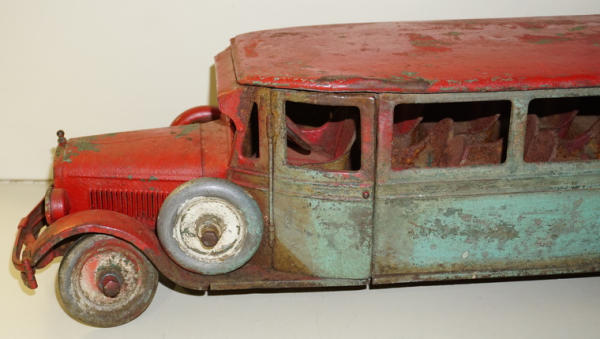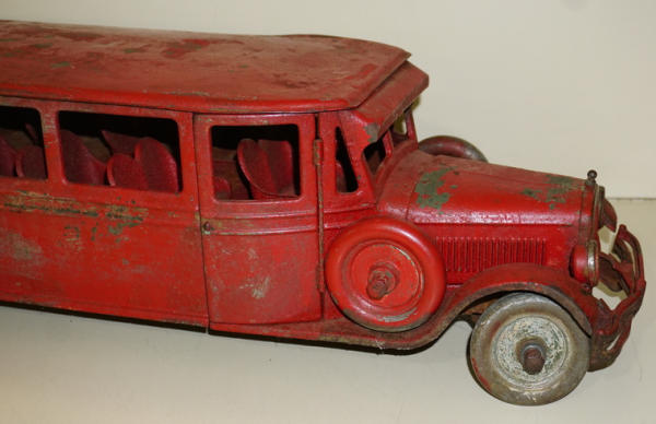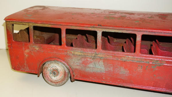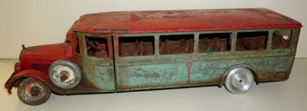 29" long, very heavy pressed steel, poor old repaint, but looks to be pretty straight and complete, one wheel has been replaced, needs restoration, but a pretty rare big Buddy L Bus!