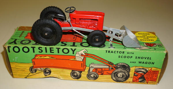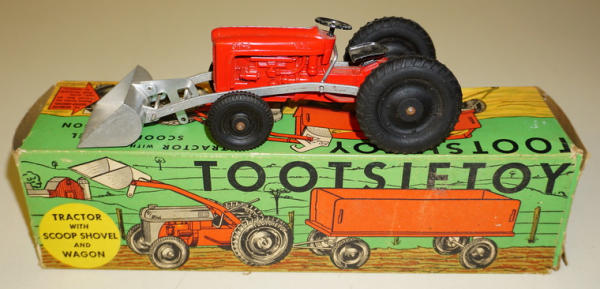 about 1/32nd scale, toy is nice, but could use a cleaning, box is complete, but fairly heavy wear, rates 7 condition; should have had a wagon originally, but we don't have