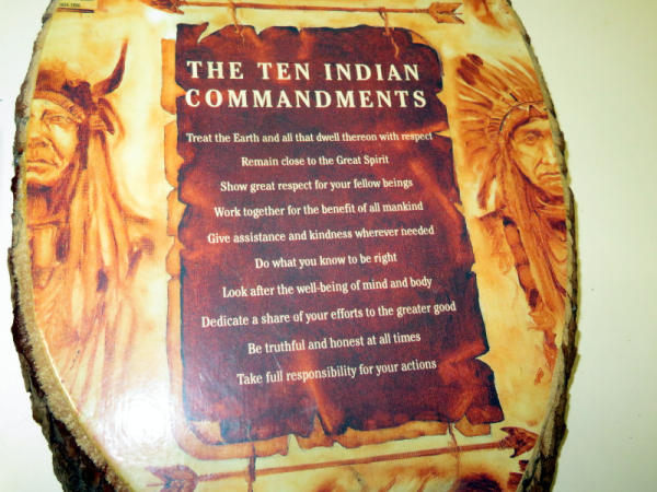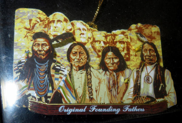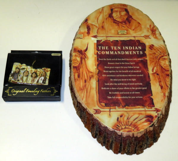 Commandments are on a piece of wood 15" tall; founding fathers is chiefs in front of Mt. Rushmore, Xmas ornament style; both nice; sell for one money