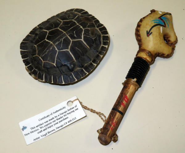 rattle is made by Virgil Brown, nice detail and 7" long; shell is real and 4" long; sell for one money