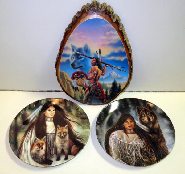 Plates are by Sandra Hill; wall hanging is Mystery Spot of Santa Cruz, CA; all very nice; plates are 8" diameter; sell for one money