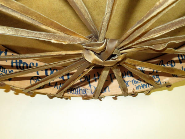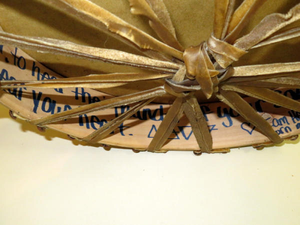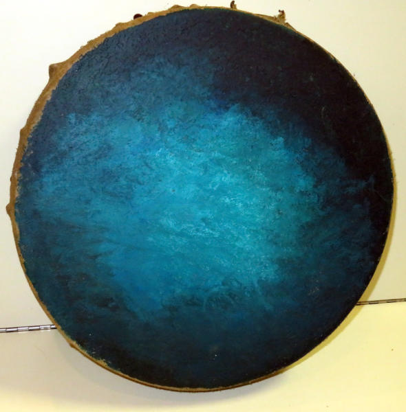 very nicely made and painted hide; wood ring has poem/prayer wrote on the inside; signed and dated 11/5/17; 15" diameter