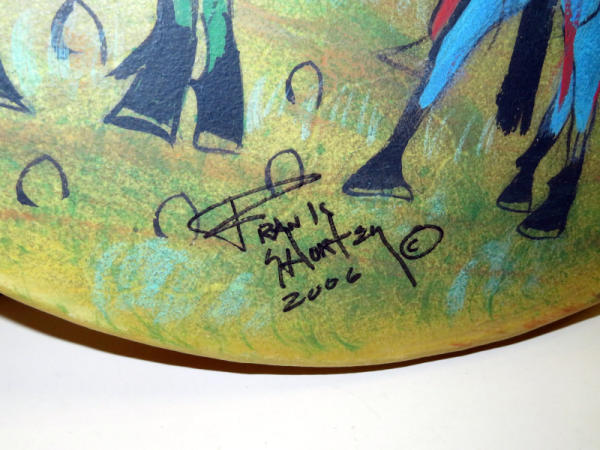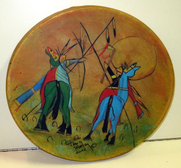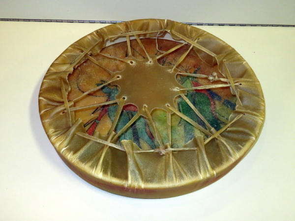 very nice painting on hide; can't make out the signature; 15.5" long;