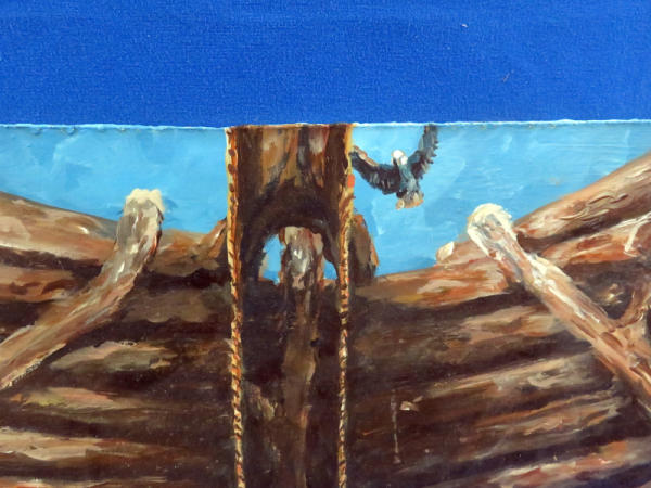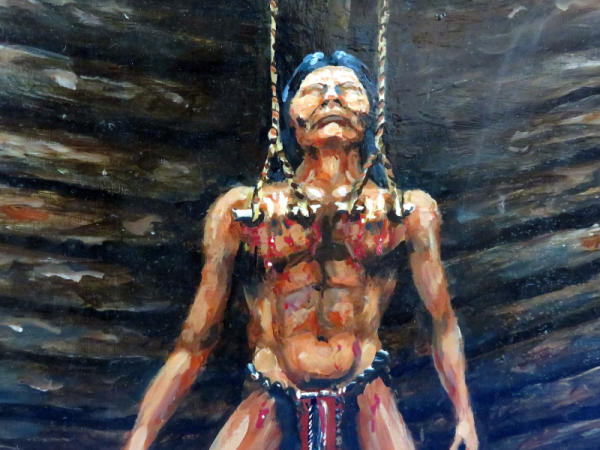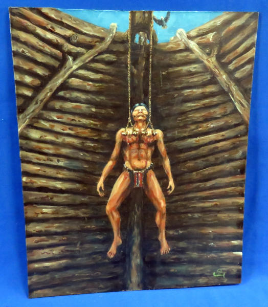 depicts native man hanging by chest; very detailed; signed but unknown artist; amazing piece of artwork! On hard canvas; 16"x20"