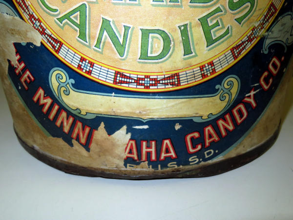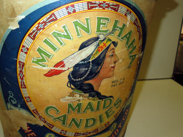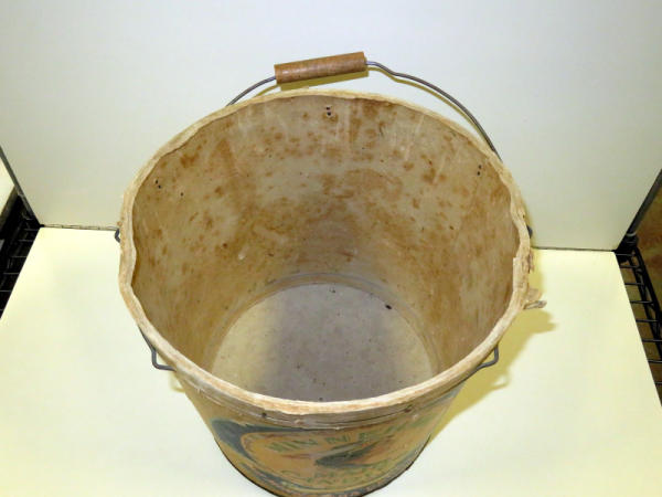 paper label has some wear, but show amazing graphics and color of an Indian Maiden; wire handle; no lid; 12" tall