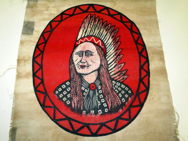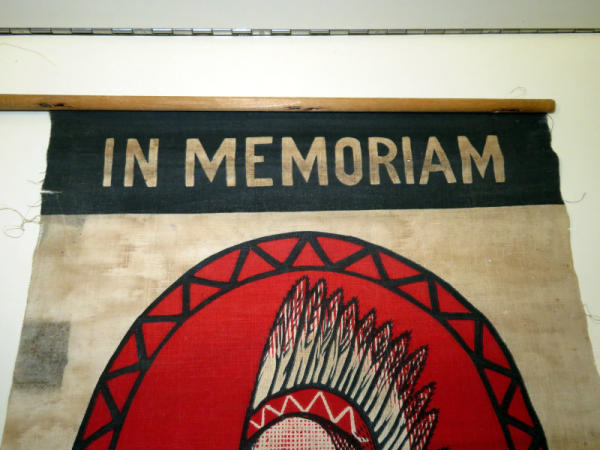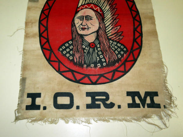 from the fraternal group Improved Order of Red Men; flag shows age but awesome graphics; cloth flag on wooden dowel; flag is 17"x12"