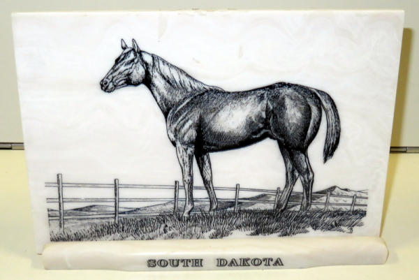 has marble base; high detailed etched picture of horse; slab is 8.5"x6"