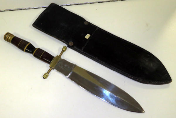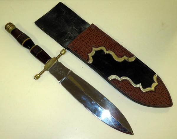believe modern made; wood handle w/brass guard; blade is 8" long; alligator? Skin leather sheath; no makers name