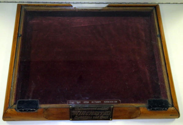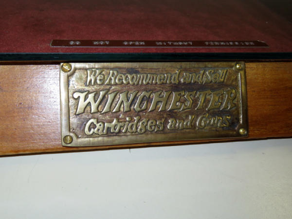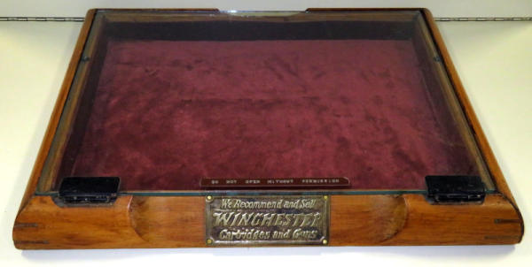 very nice showcase to display knives and small memorabilia; has brass Winchester plaque on front; wood frame is 18"x14"; display area is 15"x11"x1.25"; nice showcase
