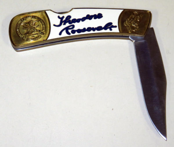 made of resin on wood base; nice detail; pocket knife is Lim. Ed.; statue is 11.5" tall