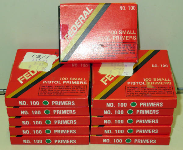 believe 11 full boxes of 100; 1100 total; they are all taped shut but sound full; sell for one money; NO SHIPPING ON PRIMERS
