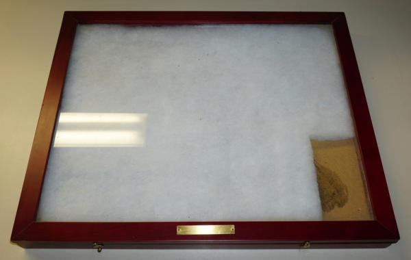 glass front, wood, 23"x18"x2"; no shipping, too fragile