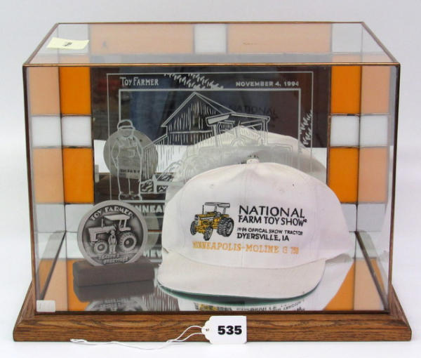 Contents include the pewter Calendar Medallion, Cap; 14" x 10" w/oak base; 1994 Etching of the MM G750 w/Barn scene and Leaded Glass Border on the rear pane. Displayed at the TF Museum