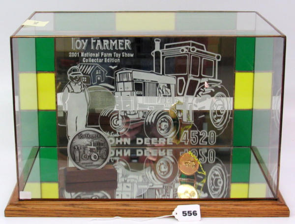 14.5" x 10" w/oak base; Calendar Medallion and Gold Medallion; Leaded Glass rear pane border w/JD 4520 etching, Zeke and Toy Farmer; Displayed at the Toy Farmer Museum