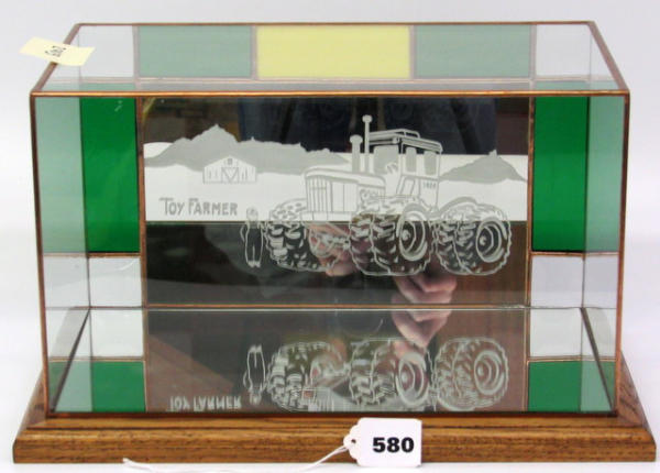 Rear pane leaded glass border w/JD 7520 & Toy Farmer Etching; Displayed at the Toy Farmer Museum
