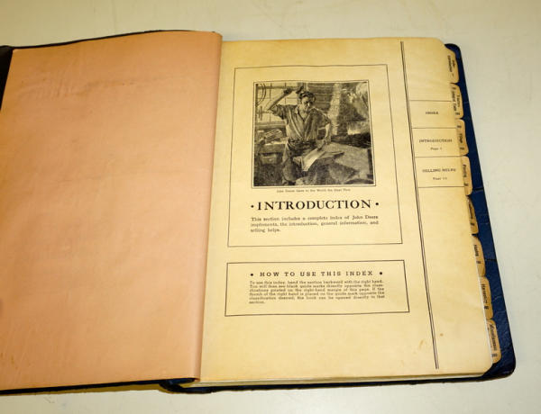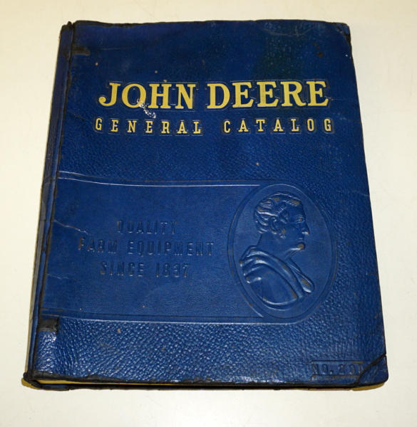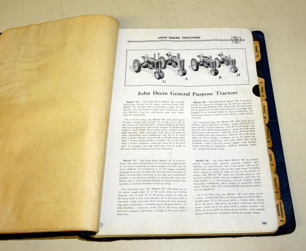 over 1" thick of material, has the tractors plus lots of implements; this piece does have some water damage, pages don't seem to be stuck together, but are wrinkled, cover has heavy war