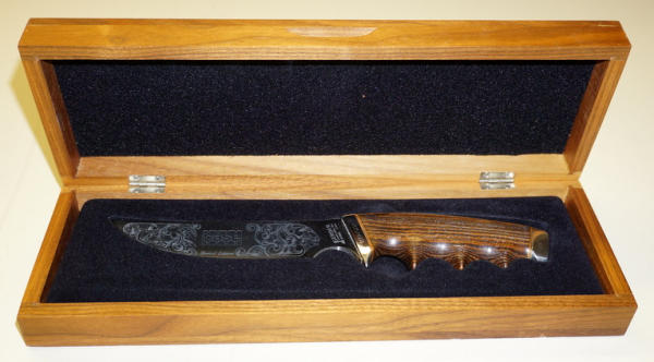 10" long, SN#1375 of 4,000 made, highly engraved on both sides of the blade, wood box with medallion inlaid, great piece, never seen one