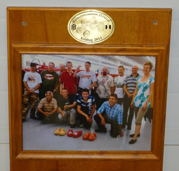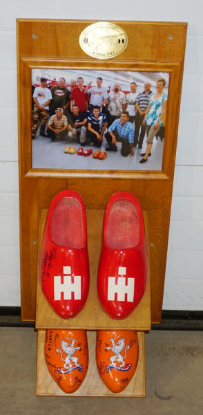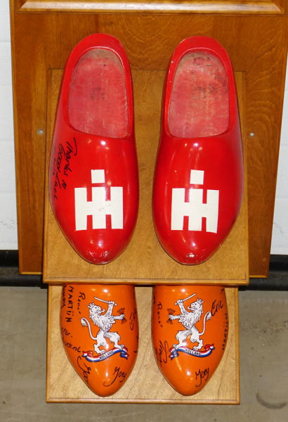 IH pair has some wear, orange set are used too and have been signed by the people in the photo; this was a group that came from Holland to visit the Museum; very heavy and unique display, nice brass medallion at the top, stands 36" tall, 17" wide; shippable, but very heavy