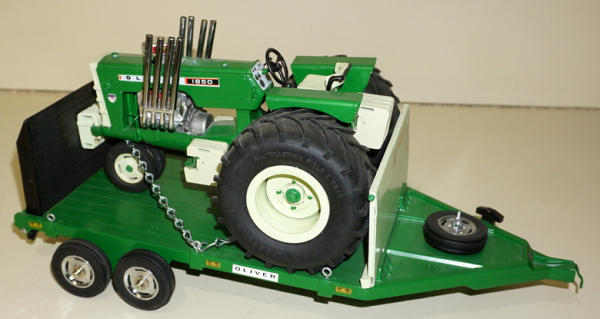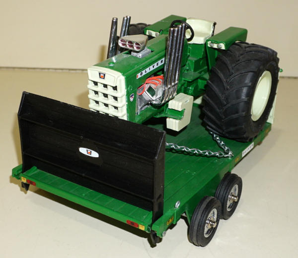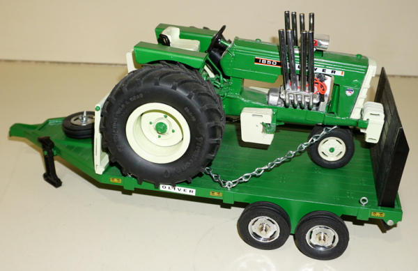 Full custom tractor, Wide Tires, V-8 Engine, air-cleaner through the hood, trailer is an Ertl that has been customized to match; I sold this toy Jerry several years ago, believe it was one Gene Ficken built, sells as a family, very nice