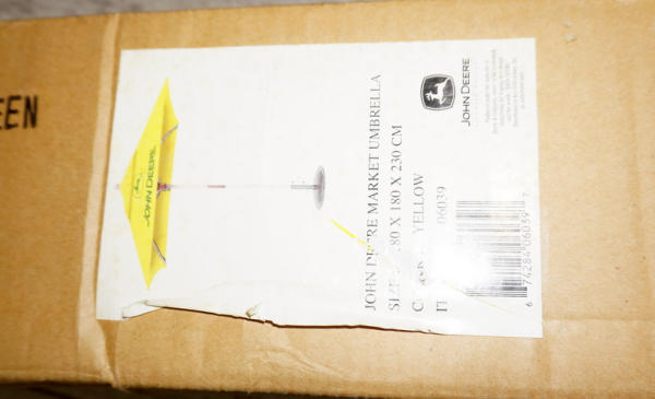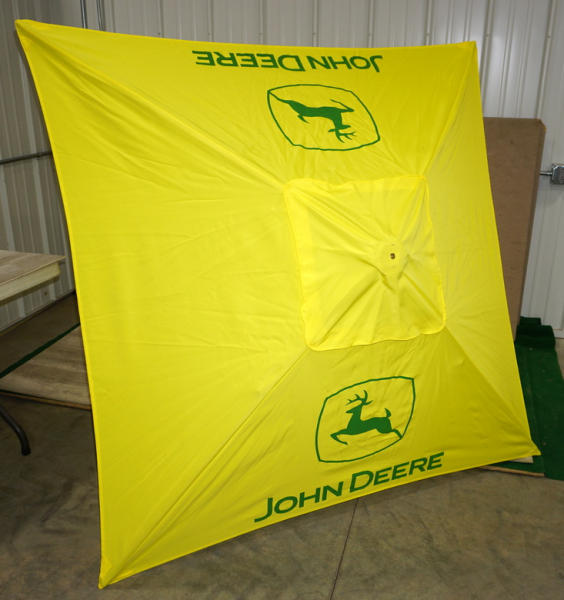brand new in the box, modern logo, umbrella is about 68"x68", pole is about 8' tall