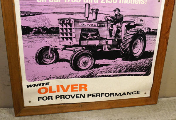 in wood frame, heavy wear, has a large puncture hole above the tractor, some water damage, not sure if the original frame, 24"x38" overall