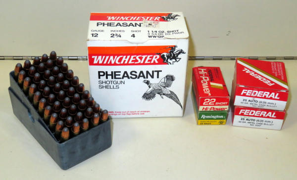 50 rounds of .30 carbine (believe reloads); 100 rounds .22 Short; 37 rounds .25 Auto; empty Win. Pheasant 12ga. Box; sell for one money