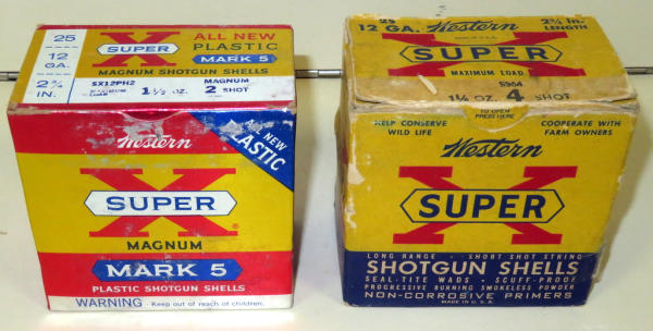 both box has some wear; 2-shot plastic shells in glossy box; 4-shot paper shells; both full; 50 rounds total; sell 2x the money