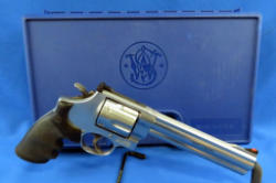 6.5" stainless barrel; swing out cylinder; used but overall nice shape; front red ramp sight w/white outline rear; factory rubber grips; factory hard case; fully targeted; SN#CJF3547