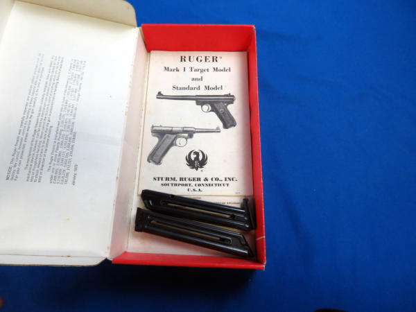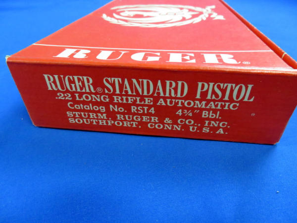 4.75" Tapered BBL; original hard plastic checkered grips; includes 3 magazines; has some very minor spotting on the right side of the barrel; original box; SN#212-82800