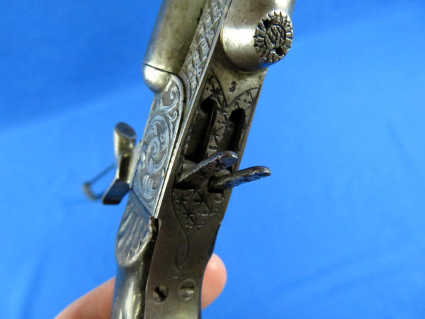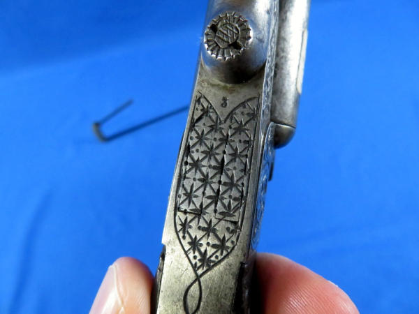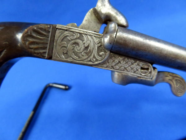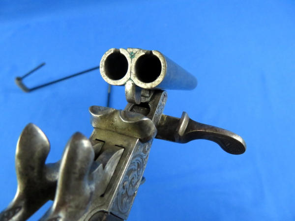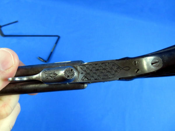 believe to be French made; wood grips; highly engraved receiver; triggers lay flat until the hammers are cocked; easy break action; only marking are a no. 3; 3.25" barrels; neat piece; NO FFL transfer needed