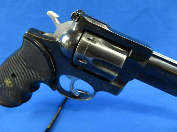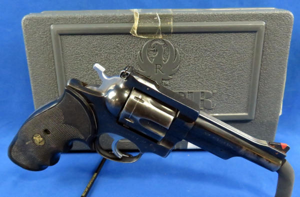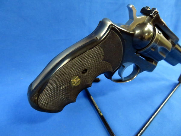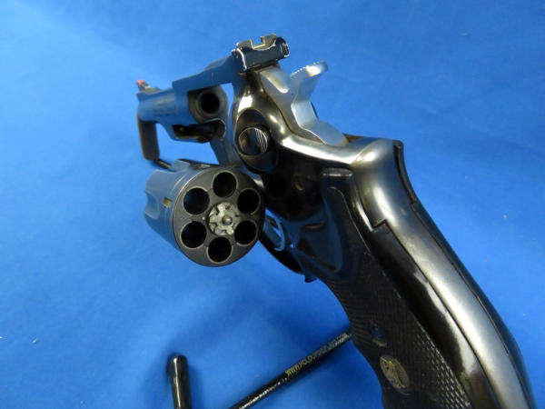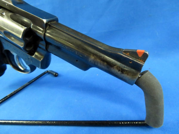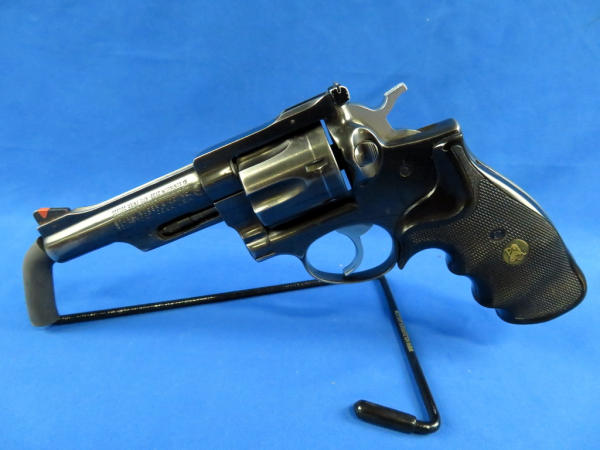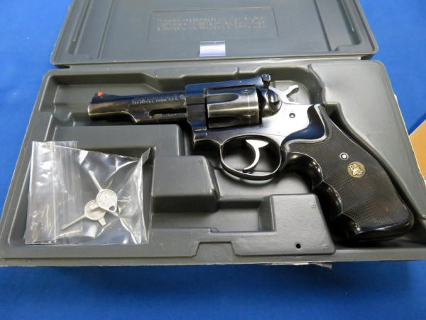 4" BBL; has heavy bluing loss on barrel & cylinder; swing out cylinder; Pachmyer rubber checkered target grips; red ramp front sight w/rear white outline; includes factory hard plastic case; SN#58-43261