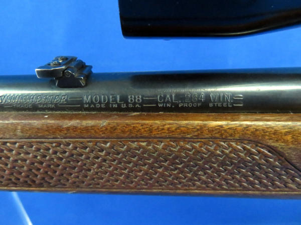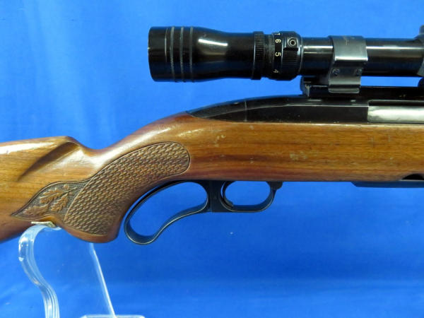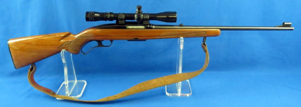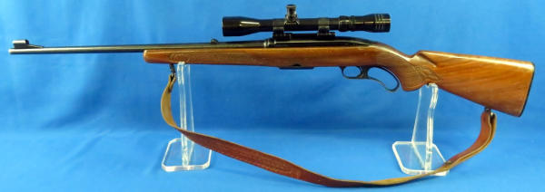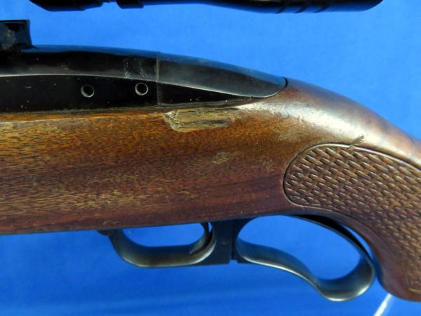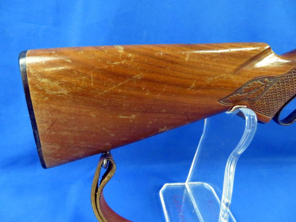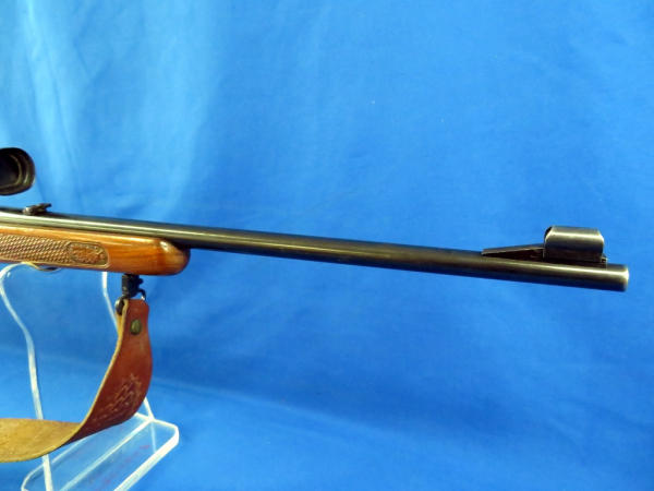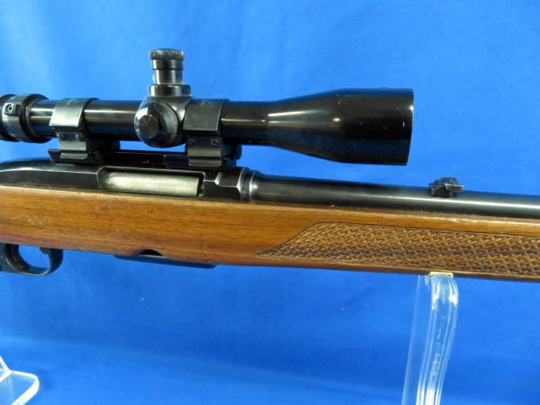 22" BBL; 2nd hardest caliber to find; nice basket weaver checkering in stock; wood finish is worn; leather sling; older Redfield 3x-9x scope is clear; removable clip; SN#222643A