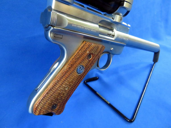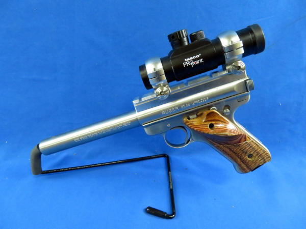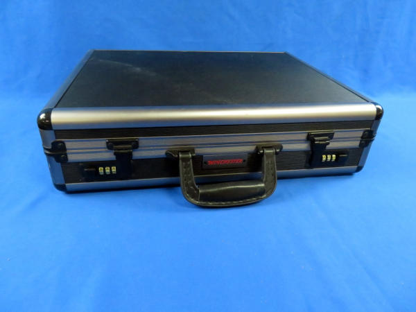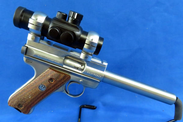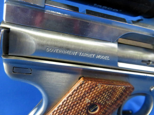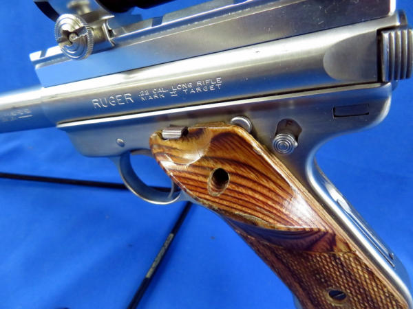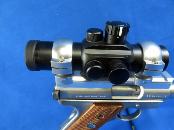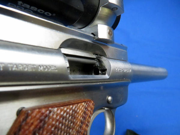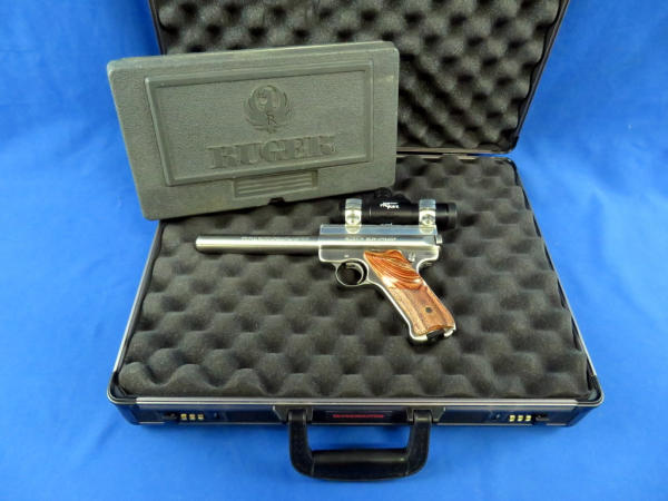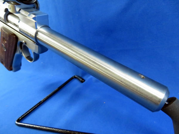 7" stainless barrel; Tasco Pro-Point sight; includes original hard factory case & large Winchester padded carry case; needs a good cleaning, has quite a bit of buildup inside receiver; factory checkered wood grips; SN#223-92517